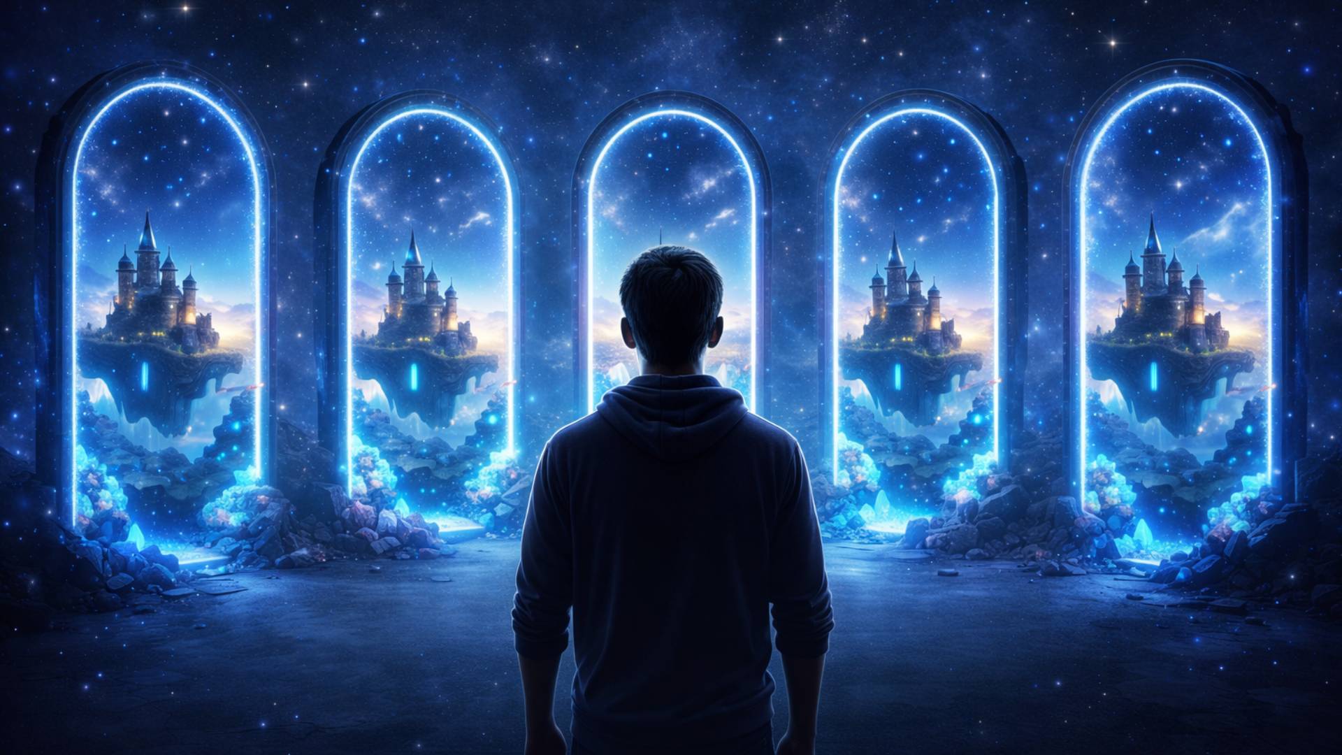 Spieler steht vor fünf leuchtenden Spielwelten, die symbolisch für die dominierenden Live-Service-Spiele auf PlayStation stehen